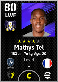 . Mathys Tel is a Left Wing Forward footballer from France who plays for Tottenham Wb in eFootball 2026.