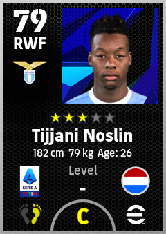 . Tijjani Noslin is a Right Wing Forward footballer from Netherlands who plays for S.s. Lazio in eFootball 2026.