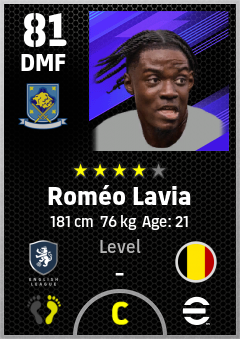 . Roméo Lavia is a Defensive Midfielder footballer from Belgium who plays for Chelsea B in eFootball 2026.