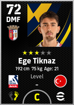 . Ege Tiknaz is a Defensive Midfielder footballer from Türkiye who plays for Sporting Braga in eFootball 2026.
