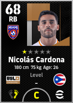 . Nicolás Cardona is a Right Back footballer from Puerto Rico who plays for Miami Fc in eFootball 2026.