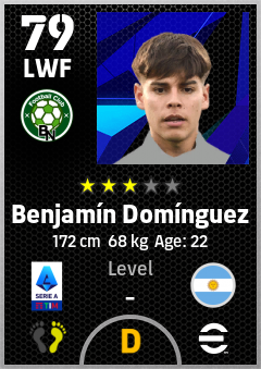 . Benjamín Domínguez is a Left Wing Forward footballer from Argentina who plays for Bologna Rb in eFootball 2026.