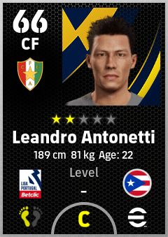 . Leandro Antonetti is a Center Forward footballer from Puerto Rico who plays for Cf Estrela Da Amadora in eFootball 2026.
