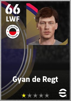. Gyan De Regt is a Left Wing Forward footballer from Netherlands who plays for Excelsior Rotterdam in eFootball 2026.