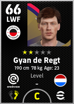. Gyan De Regt is a Left Wing Forward footballer from Netherlands who plays for Excelsior Rotterdam in eFootball 2026.