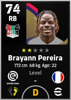 . Brayann Pereira is a Right Back footballer from France who plays for N.e.c. Nijmegen in eFootball 2026.