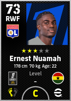 . Ernest Nuamah is a Right Wing Forward footballer from Ghana who plays for Olympique Lyonnais in eFootball 2026.