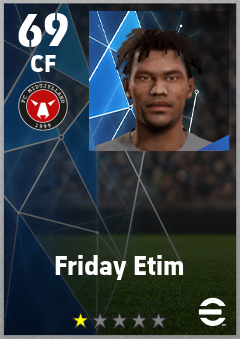 . Friday Etim is a Center Forward footballer from Nigeria who plays for Midtjylland Sr in eFootball 2026.