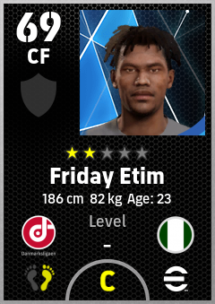 . Friday Etim is a Center Forward footballer from Nigeria who plays for Fredericia Rs in eFootball 2026.