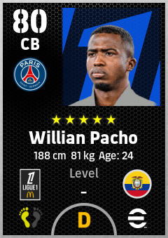 . Willian Pacho is a Center Back footballer from Ecuador who plays for Paris Saint-Germain in eFootball 2026.