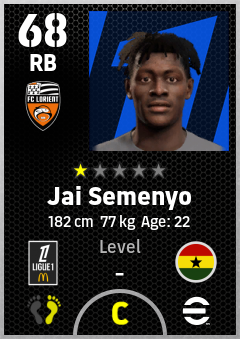 . Jai Semenyo is a Right Back footballer from Ghana who plays for Fc Lorient in eFootball 2026.