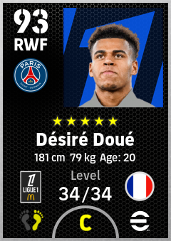 . Désiré Doué is a Right Wing Forward footballer from France who plays for Paris Saint-Germain in eFootball 2026.