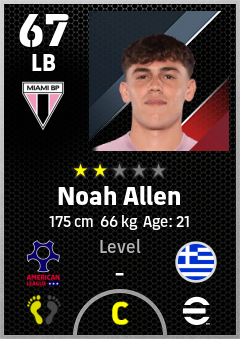 . Noah Allen is a Left Back footballer from Greece who plays for Miami Bp in eFootball 2026.