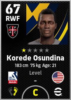 . Korede Osundina is a Right Wing Forward footballer from United States who plays for Casa Pia Ac in eFootball 2026.