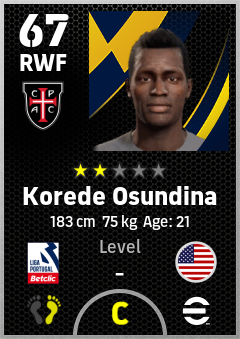 . Korede Osundina is a Right Wing Forward footballer from United States who plays for Casa Pia Ac in eFootball 2026.
