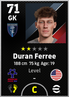 . Duran Ferree is a Goalkeeper footballer from United States who plays for San Diego Bw in eFootball 2026.