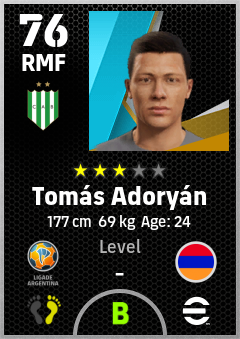. Tomás Adoryán is a Right Midfielder footballer from Armenia who plays for Banfield Vb in eFootball 2026.