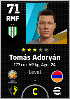 . Tomás Adoryán is a Right Midfielder footballer from Armenia who plays for Banfield Vb in eFootball 2026.
