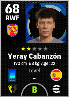 . Yeray Cabanzón is a Right Wing Forward footballer from Spain who plays for Andorra La Vella Aar in eFootball 2026.