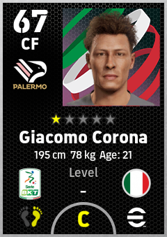 . Giacomo Corona is a Center Forward footballer from Italy who plays for Palermo Rn in eFootball 2026.