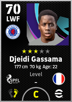 . Djeidi Gassama is a Left Wing Forward footballer from France who plays for Rangers Fc in eFootball 2026.