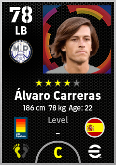 . Álvaro Carreras is a Left Back footballer from Spain who plays for Madrid Chamartin B in eFootball 2026.