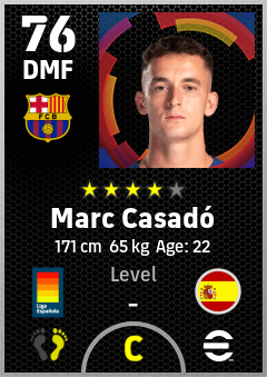 . Marc Casadó is a Defensive Midfielder footballer from Spain who plays for Fc Barcelona in eFootball 2026.
