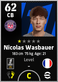 . Nicolas Wasbauer is a Center Back footballer from France who plays for Toulouse Fc in eFootball 2026.