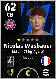 . Nicolas Wasbauer is a Center Back footballer from France who plays for Toulouse Fc in eFootball 2026.