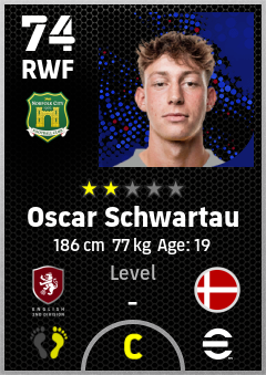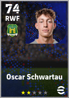 . Oscar Schwartau is a Right Wing Forward footballer from Denmark who plays for Norwich Yg in eFootball 2026.