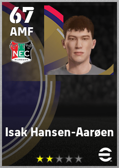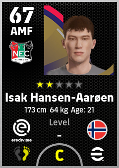. Isak Hansen-Aarøen is a Attacking Midfielder footballer from Norway who plays for N.e.c. Nijmegen in eFootball 2026.