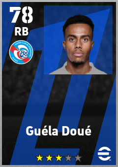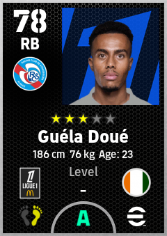 . Guéla Doué is a Right Back footballer from Côte D'ivoire who plays for Rc Strasbourg Alsace in eFootball 2026.