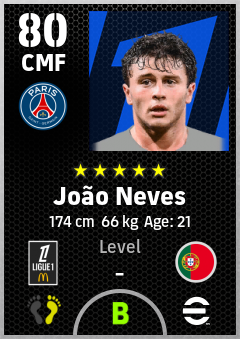 . João Neves is a Center Midfielder footballer from Portugal who plays for Paris Saint-Germain in eFootball 2026.
