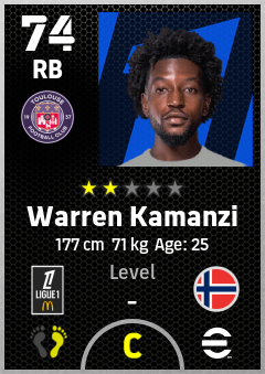. Warren Kamanzi is a Right Back footballer from Norway who plays for Toulouse Fc in eFootball 2026.