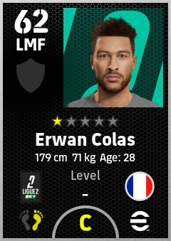 . Erwan Colas is a Left Midfielder footballer from France who plays for Le Mans Fc in eFootball 2026.