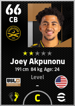 . Joey Akpunonu is a Center Back footballer from United States who plays for Charleston Battery in eFootball 2026.