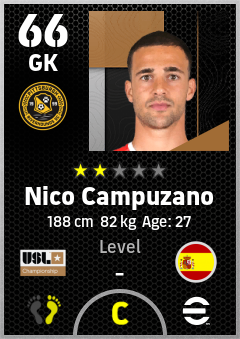 . Nico Campuzano is a Goalkeeper footballer from Spain who plays for Pittsburgh Riverhounds in eFootball 2026.
