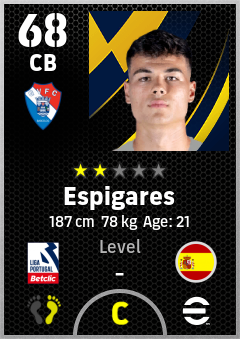 . Espigares is a Center Back footballer from Spain who plays for Gil Vicente Fc in eFootball 2026.