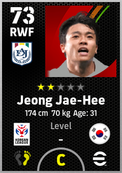 . Jeong Jae-Hee is a Right Wing Forward footballer from Korea Republic who plays for Daejeon Rgw in eFootball 2026.