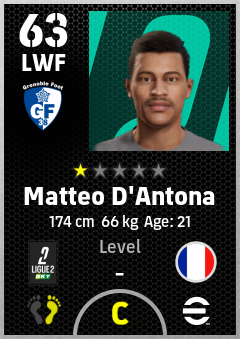 . Matteo D'antona is a Left Wing Forward footballer from France who plays for Grenoble Foot 38 in eFootball 2026.