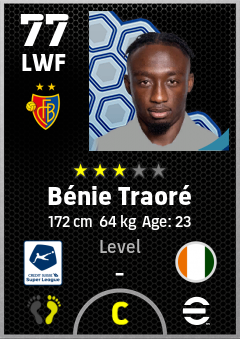 . Bénie Traoré is a Left Wing Forward footballer from Côte D'ivoire who plays for Basel Rb in eFootball 2026.