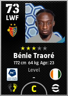 . Bénie Traoré is a Left Wing Forward footballer from Côte D'ivoire who plays for Basel Rb in eFootball 2026.