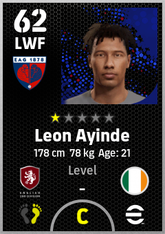 . Leon Ayinde is a Left Wing Forward footballer from Republic Of Ireland who plays for Ipswich Bw in eFootball 2026.