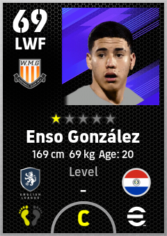 . Enso González is a Left Wing Forward footballer from Paraguay who plays for Wolverhampton Yb in eFootball 2026.