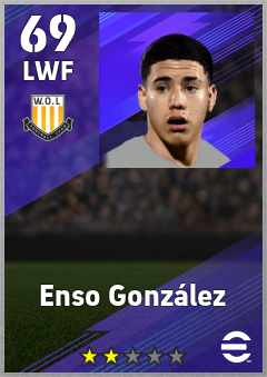 . Enso González is a Left Wing Forward footballer from Paraguay who plays for Wolverhampton Yb in eFootball 2026.