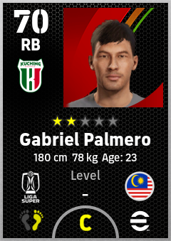 . Gabriel Palmero is a Right Back footballer from Malaysia who plays for Kuching City Fc in eFootball 2026.