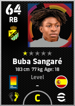 . Buba Sangaré is a Right Back footballer from Spain who plays for Elche Bv in eFootball 2026.