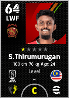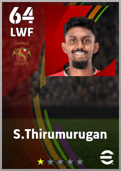. S.thirumurugan is a Left Wing Forward footballer from Malaysia who plays for Kelantan Trw Fc in eFootball 2026.