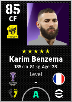 . Karim Benzema is a Center Forward footballer from France who plays for Al Ittihad Club in eFootball 2026.
