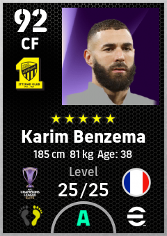 . Karim Benzema is a Center Forward footballer from France who plays for Al Ittihad Club in eFootball 2026.
